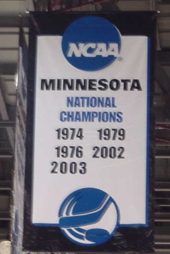 In the rafters were banners for all of the schools that have titles. Notice the odd numbering for Minnesota's 2003 win as compared to the others. Well, during the first semifinal game, there was no "2003". Apparently somebody ran out to Kinko's between semifinal games and had that fixed.