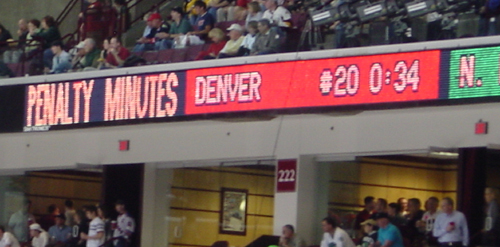 The "Schott" is a great building, but it is first and foremost a basketball building. The scoreboard is incapbale of doing penalty minutes, so it had to be done on a side board.
