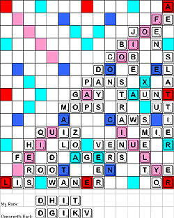 Since I'm not at tournament level yet, I have to play somewhat defensive, mainly by clogging up the board and making your opponent's life by limiting the amount of 2 letter "hooks" that can be played to stop 7 letter words. This ended up being the result, we had to stop when there was not another play possible on the board. Two of the words my opponent played, 'SLATTIER' and 'MIE' are phonies, the former I thought was OK and the second I knew was bad but I also knew that the only letter left in the tile bag was the 'K' and darn if I was going to get stuck with it. I won 339-314.