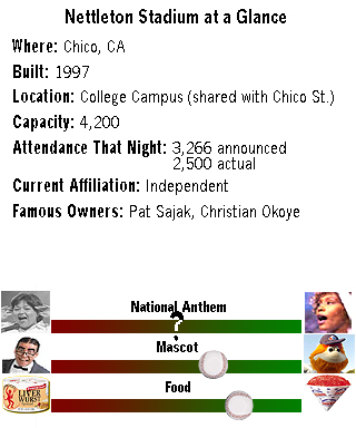 Saturday was going to be a very ambitious day. Maybe too ambitious. I first drove up to Arcata, California (a six hour trip from the Bay Area). When you first look at a map, you think there is no way that this could take six hours. Maybe five, after all, it's only 320 miles. But, since most of it is not on freeway, and you do have to slow down through some small towns, it really is 6 hours. And if you're wondering why I had to see this place, it is reputed to be the most liberal town in the nation. It's the only town in the U.S. where the majority party on the city council is the Green Party. They voted an amnesty for people who didn't want to serve in the Gulf War. The first one. It is a crime for a city employee to comply with the Patriot Act. However, they're having a problem with the liberalism going too far, especially in the downtown area. Since people try to be incredibly tolerant, it becomes a magnet for loitering, panhandling and dubious legal activity. So, while trying to be incredibly liberal, it also has to be incredibly totalitarian. Smoking is illegal downtown, even outdoors. If you have a dog, you can only walk the dog downtown. You can't stop. Every third store seems to be some sort of "peace center" or art store. And typical of most liberal hamlets, you need to be rich to live there, since the average home value exceeds the county and the U.S. average even though the income is below the county and U.S. average. If you wish to take a virtual tour of Arcata, there is no better place than their local newspaper's Police Log. After 150 minutes of harrowing mountain driving made worse by an incorrectly marked state route, I got at least down to Redding and an hour later I was in Chico, missing the first two innings. When Playboy first announced their Party School list in 1987, Chico State was #1. When they did it again in 2002, at least Chico St. cleaned up their act, they're now #2 (thanks Arizona State!). And the stadium for the team was on campus, meaning that families going out for a night at the ballpark had to walk by lawn kegger parties. The stadium itself was very nice, the open barbecue was wonderful and with fireworks after the game, most people stayed meaning I could get a quick getaway once the game was over. The team playes in the Golden Baseball League, a new eight team league which has become my favorite minor league for one reason -- no designated hitter. Which was a nice bonus when a pitcher hit a homer. |