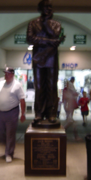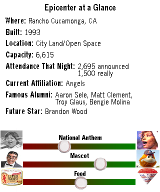 The game show portion of the trip ended and the baseball portion began when I went to Rancho Cucamonga to see the first of six consecutive games, taking in the first of three consecutive California League (full season A) games. The team is called the Quakes, they play at the Epicenter, which seemed cute then but recent events really put a pall on having a natural disaster theme for a sports team (good luck Carolina!). There's nothing spectacular about Rancho Cucamonga to lend itself to a name other than a Mel Blanc/Jack Benny routine, and the name Rancho Cucamonga Jack Bennys just doesn't have the same ring. However, the stadium does understand the connection, as there is a statue of Jack Benny at the entrance and the stadium is on Rochester Street and Jack Benny Way.
