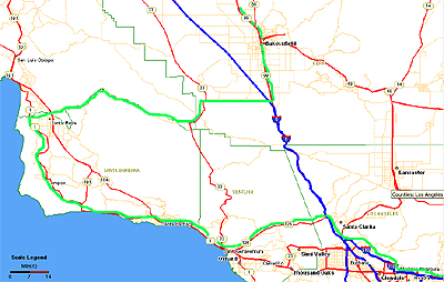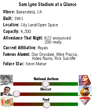The morning started with a drive from Pasadena to Simi Valley. Apparently this is not a very popular commute route, because I was actually able to go the speed limit, beyond the speed limit, and get to the Reagan Library before it opened at 10 AM. So, after some picture taking of the view, I went inside the Library and Museum. Nothing really great there except for the rotating exhibit, which was the history of the U.S. Calvary. That was actually very interesting, but also is pretty pointless for me to go into too much detail because it will be rotated out by the time you read this. After the Reaganness I went to the tourist trap of Santa Barbara. Apparently, it is law there that everybody must own a dog, or everybody must be walking one. Had lunch, moved up the coast, saw a great restaurant name in Lompoc -- Hi!, Let's Eat -- and then had to veer off the 1 if I wanted to get to Bakersfield. That was some interesting mountain driving, bascially because it was pretty townless and I saw a gas station selling for $3.22 (this was well before Katrina). I then get into Bakersfield, and see the day descend into parody. Since I am short on cash, I am trying to find a bank. They don't seem to have banks in Bakersfield. They had a bail bonds district (must be keeping Captain Stiles busy). They even had a Euro-style roundabout. But a surprising lack of banks. I finally found a credit union, got my money, and was off to the ballpark. It is never a good sign if you don't have to pay to park. Oh, you would think that is a good sign, but that means there won't be enough people here to go through the trouble of paying an attendant.