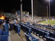 I get to the window, I ask for "any seat not looking into the sun", since it is nearly 100 degrees and for some really stupid reason home plate faces west. I was told by the ticket attendant (the only ticket attendant they had) that don't worry, they wouldn't start the game until after sundown anyway. So I get a ticket, move to another seating area because that ticket sucked, and was on my way to answering the age old question -- if they play a baseball game and no one shows up, does it count in the standings. A quirky part of the ballpark is that centerfield is only 354 feet from home plate (due to some train tracks, they unfortunately eschewed the chance for a Brewster's Millions moment), although it is a 15 foot fence. I pretty much have a section to myself. Somebody comes by in the sixth inning and sits a couple of rows up, but other than that, it's going to be one lonely evening. There's no mascot although their web site says there is one named Heater, he must work weekends. There is some overweight guy who dances during inning breaks, but that doesn't count. But, in the eighth inning, there was magic in the air. A foul ball was hit by a Lancaster player and was going to go halfway between home and first. But it strikes a pole, and changes course towards the first base stands. One bounce. Two bounce. An eight seat roll directly into my hand. I didn't even had to get up, and I had it. A foul ball. Over hundreds of sporting events I have caught many things -- two footballs, three pucks, many basketballs, Jimmy King, but I never had a baseball. Until now. So, despite everything wrong with your town, the heat, the baffling state of your economy, I did get a prized possession. All is forgiven.