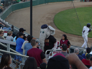 The first thing you learn about the Modesto Nuts is that their game program has the Sports Illustrated curse beat hands down. The "honored" Modesto Nut was Seth Smith, the one time backup of Eli Manning at Mississippi, who had the most bi-polar game in California League history. In the first inning and playing rightfield, he nailed a runner going from first to third on a single. In the second inning, he lost a ball in the lights (giving the scarecrow-like "I lost it" arm cue), which turned into a double. In the third inning, he lost another ball in the lights (another "I lost it" cue), but that was a home run over the wall. In the fourth inning, he got another outfield assist when he threw out a runner trying to score from first on a double. In the seventh, he dropped a fly ball (which ended up being the eighth run in an 8-7 loss), but led off the ninth with a double with a rally that fell just short.