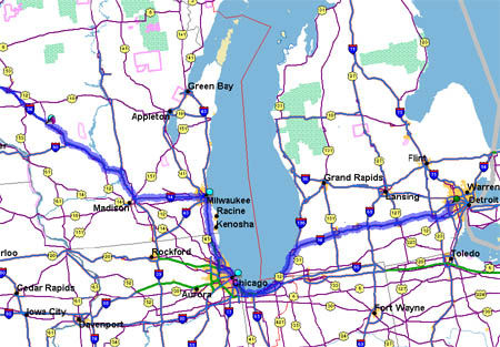 Number of miles traveled: 612 (including the 33 miles to pick up the vehicle the day before) The trip actually begins on July 3, since the van that will go cross country must be procured from the rental agency. So, all that is required is for somebody to pick me up and drive to the kickback-themed Detroit/Wayne County Metropolitan Airport. I send Craig a reminder E-mail to pick me up at 5 PM and if you're late, don't forget to put a lid on the sundae, a very obscure Simpsons reference. The sundae was delicious. Dwight arrives in the evening and we'll go over to pick up Craig and Dave the next morning. The trip begins at 7:30 AM as Dwight and I drive to Livonia to first get Craig. We get there at 8, and Craig is not up. The difficult decision -- wake up everybody or just wake up Craig. We try the latter, but he isn't answering his phone. So, unfortunately, we have to wake up everybody just to get Craig up. We get Craig by 8:15, get Dave by 8:30, and we're truly on our way. Well, except for that stop in Jackson, where it was decided everybody in the van needed a quick breakfast. Dave attempted the McGriddles, Dwight started his pork streak, Craig was flummoxed by the fact that salsa came with a breakfast burrito, and Mike just took the parts of the combo breakfasts that everyone else didn't want.